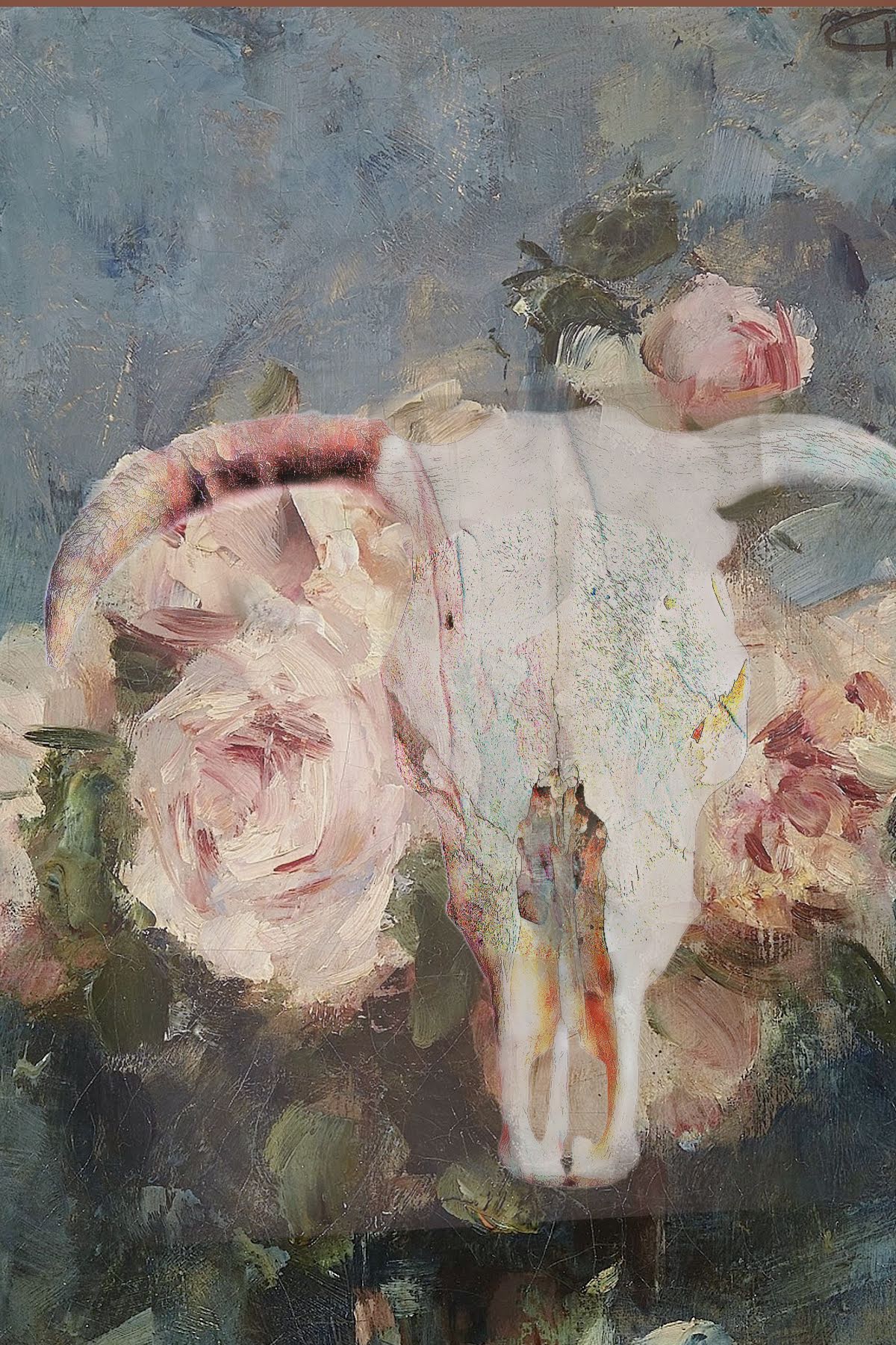 Postscript: With pieces like this, Skull and Flowers, I’m trying to push collage toward a painterly still-life surface blending fragments, softening joins, and working tone so the image reads as painted atmosphere rather than assembled parts. I also love the juxtaposition of grandma’ flowers with a skull.